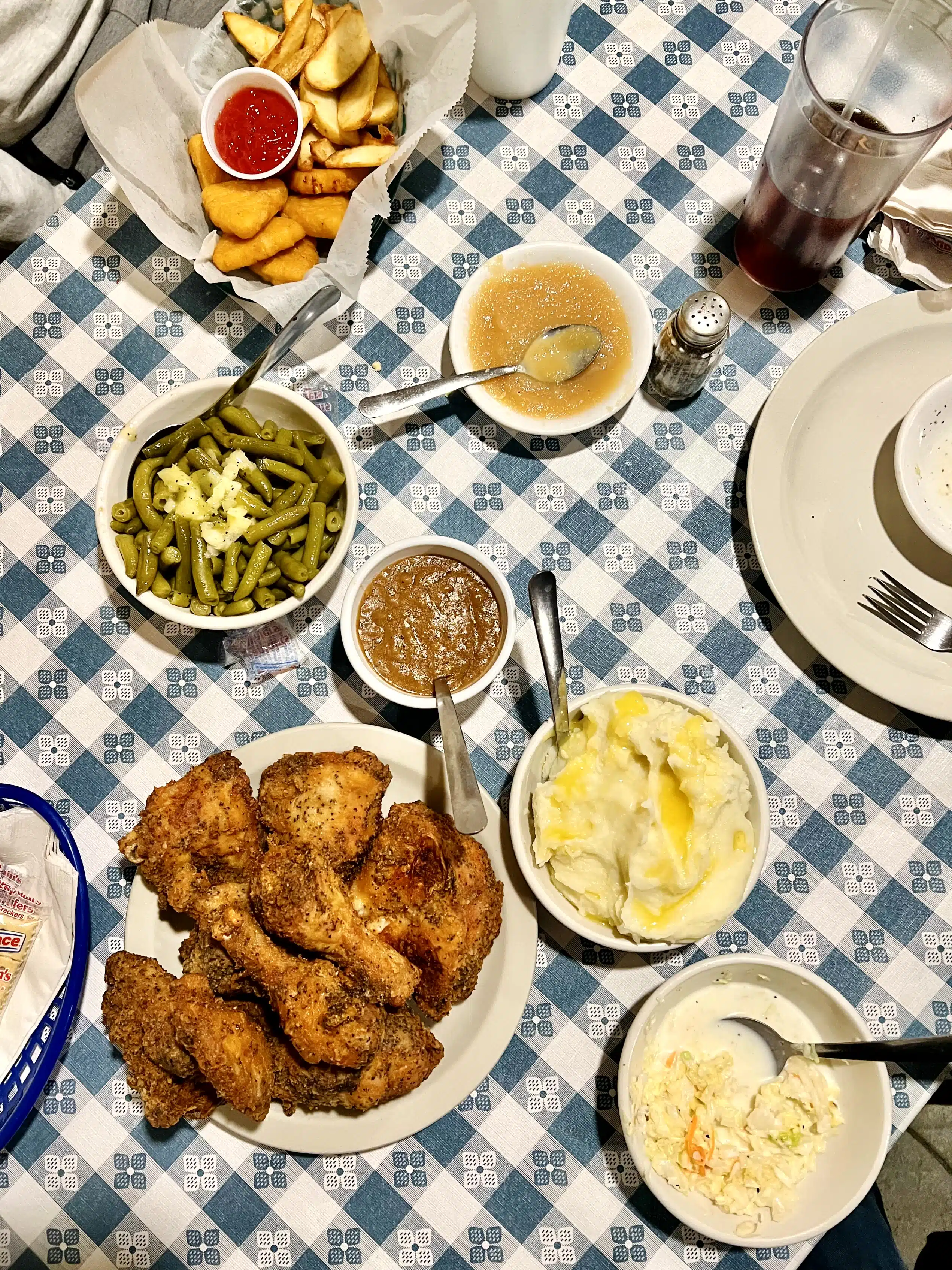 The chicken is piled high on a plate if you get the family-style chicken meal. The family meals are 1/2 of a chicken per person, with mashed potatoes and gravy, green beans and coleslaw. The sides are all-you-can-eat, but they give you a lot of food in the first serving, so you might never have to ask for a second round.