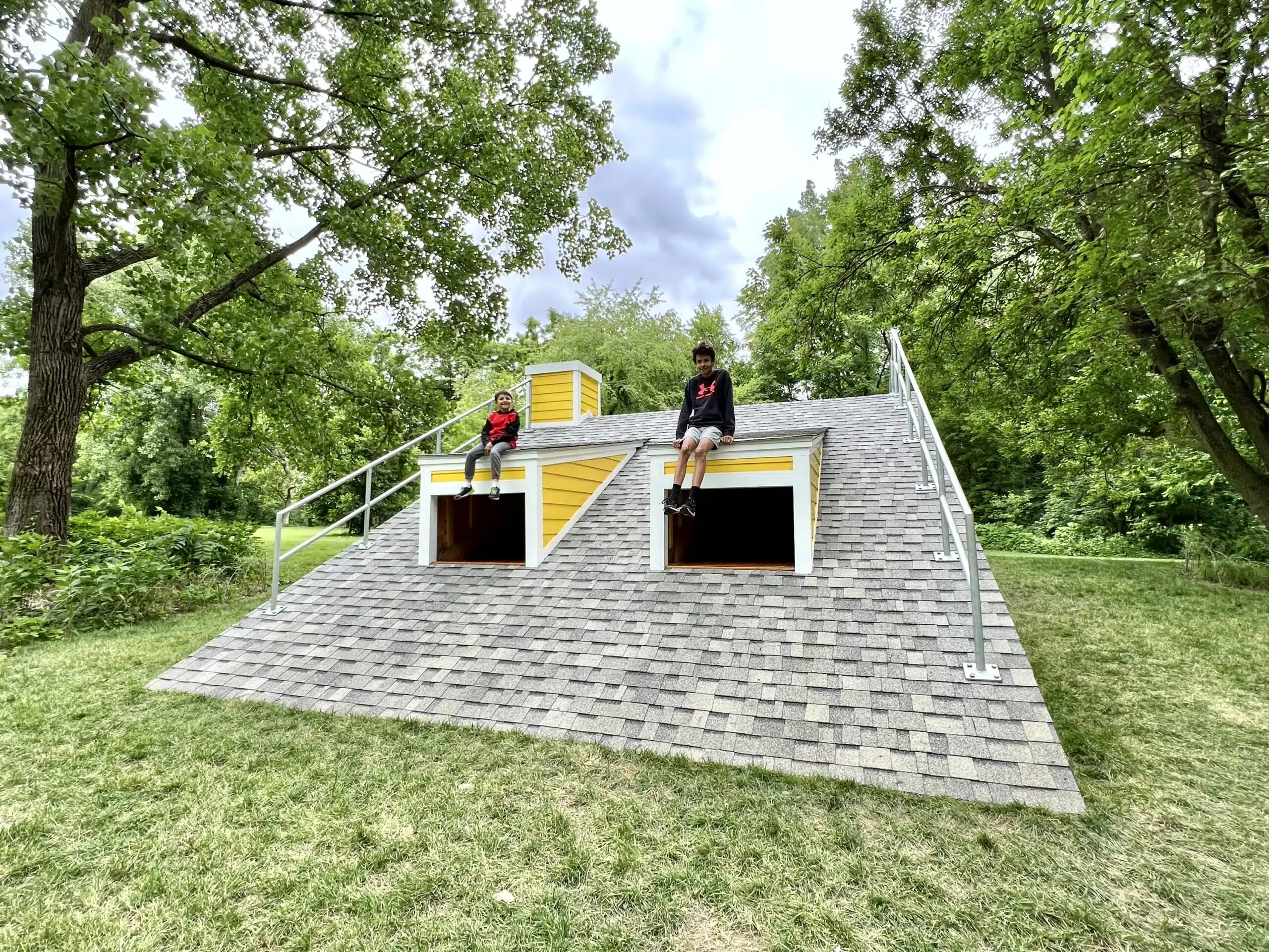 Part of the Home Again exhibition that opened in spring 2024, Oracle of Intimation is a roof-shaped sculpture in The Hawryluk Sculpture Green. It looks like a house that has been buried underground! Walk on the roof, or climb inside the house and connect your smartphone to a built-in speaker to amplify music, spoken word or other sounds.